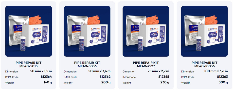 The MF40 Kit includes a fiberglass polyurethane soaked reisin bandage and a putty – a dough-like mouldable substance. MF40 can be applied to the most commonly used pipes: steel, copper, concrete, fiberglass, PVC